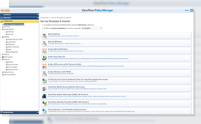 HPE CLEARPASS Policy Manager 플랫폼은 유무선 및 VPN 인프라스트럭처 전반에서 직원, 계약직, 게스트를 위한 역할 기반 및